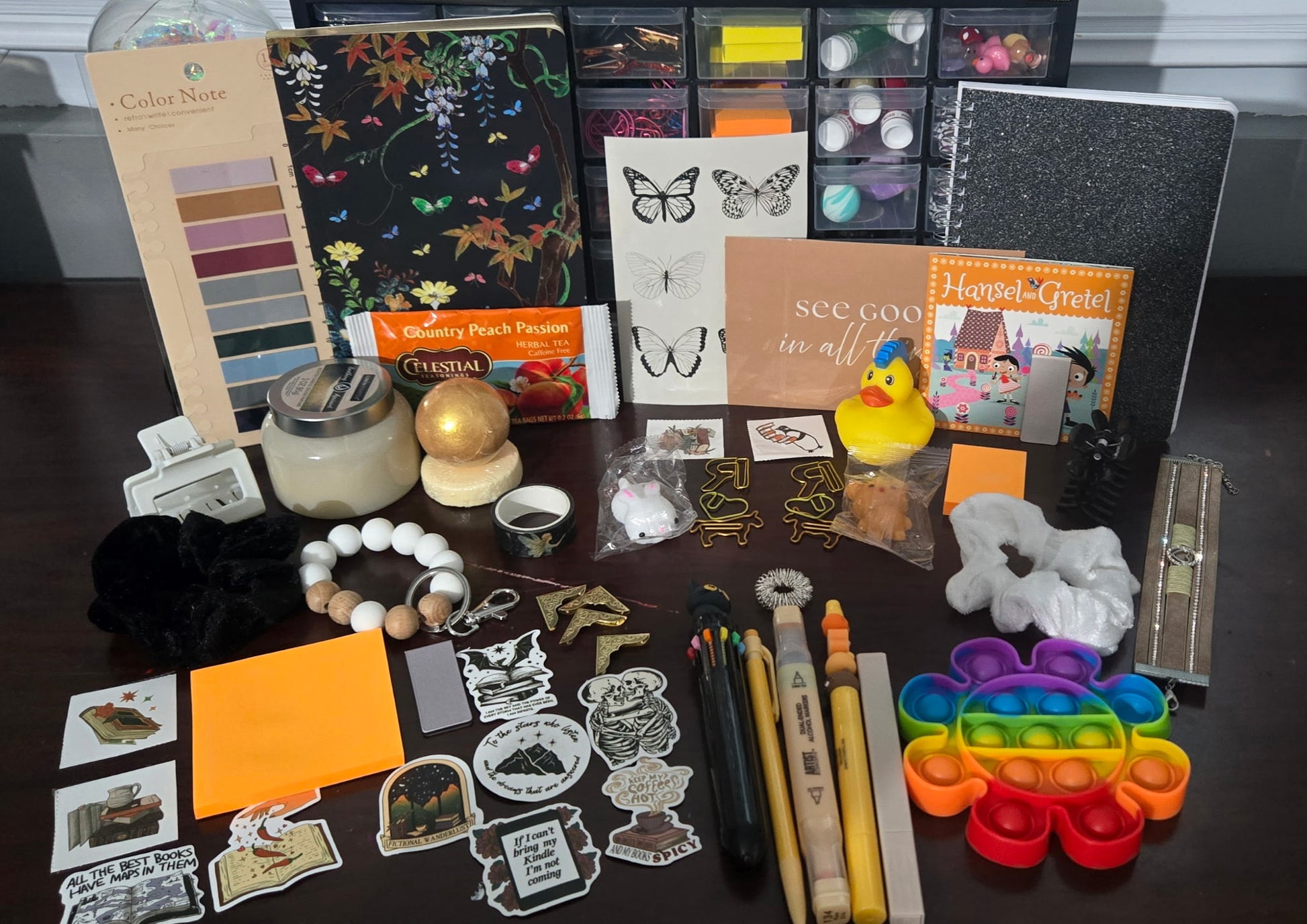 Candles, teas/cocoa, bookmarks, bath soaks, fidgets, trinkets, or cozy treats